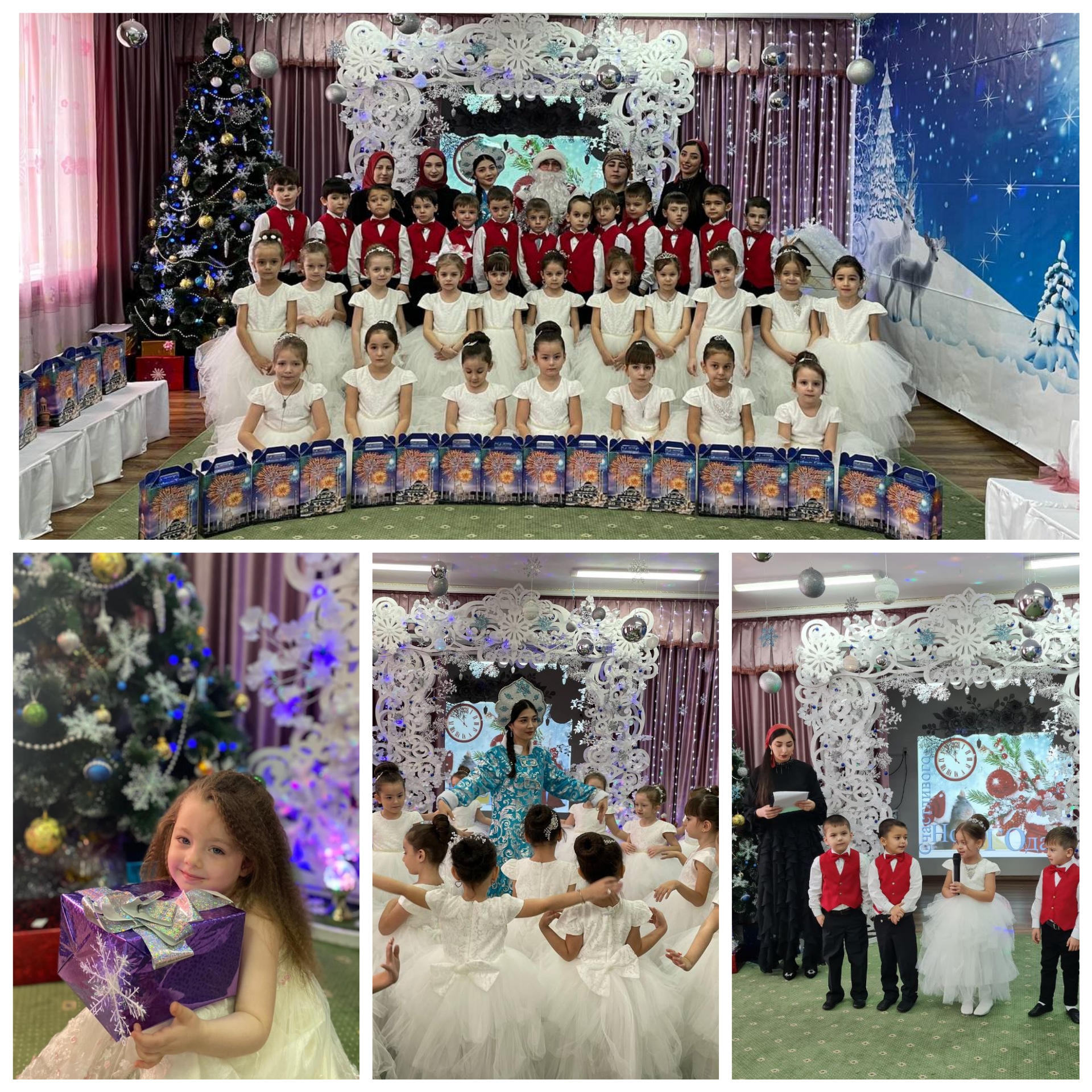 Ребята веселились с Дедом Морозом и Снегурочкой, с увлечением рассказывали стихи о зиме, вместе со сказочными героями пели, танцевали, участвовали в весёлых играх и хороводах. Все получили новогодние подарки и чудесное праздничное настроение!