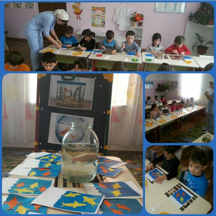 Наши дети сегодня попали в сказочный мир золотой рыбки#Аппликация."Красивые рыбки в аквариуме".▪развивать чувство композиции;-закреплять приёмы вырезания и аккуратного наклеивания.В/Нагаева Жейран.